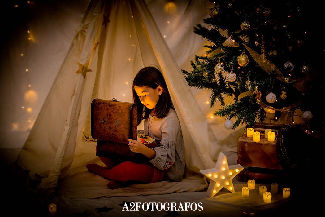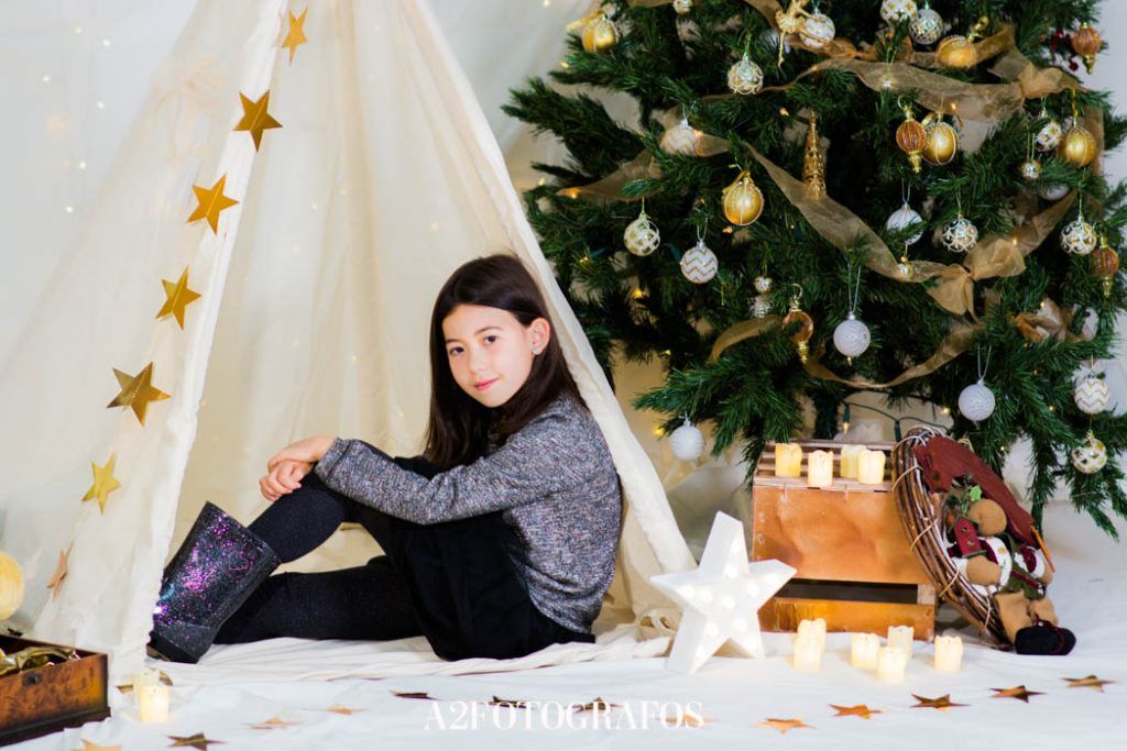 Este año tenemos dos decorados: uno es un bosque navideño y otro un interior dorado con árbol y tipi indio. Aquí tenéis unas fotos para que os hagáis una idea.